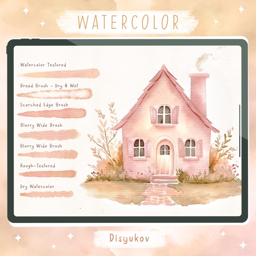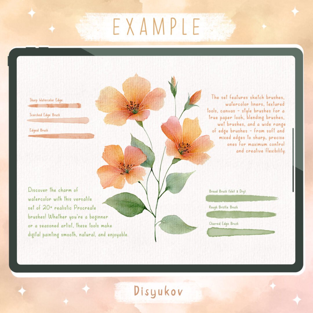 Dive into the world of watercolor with this exclusive set of 30 realistic watercolor brushes for Procreate! Perfect for both beginners and professionals, the brushes let you paint with ease while keeping the authentic feel of watercolor.