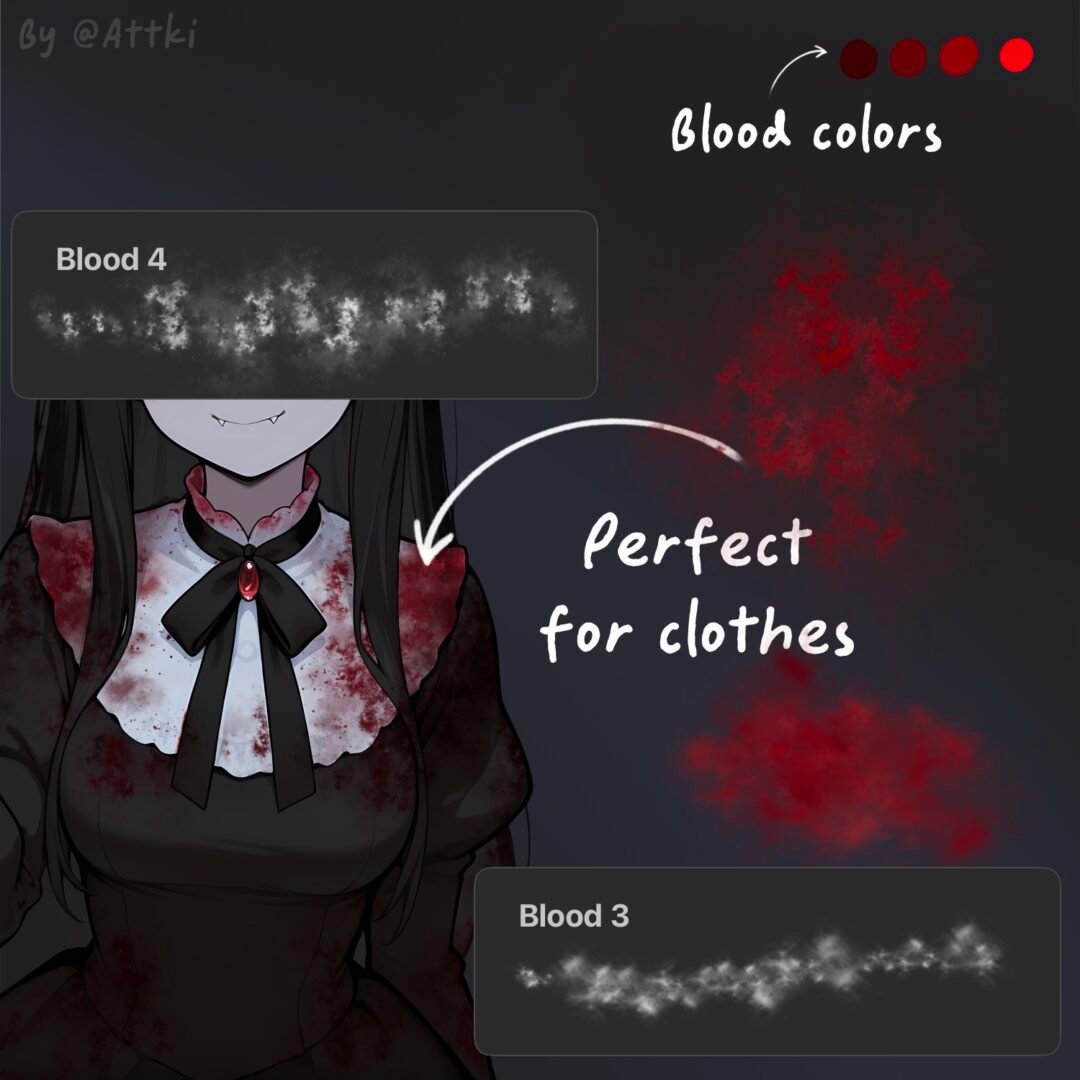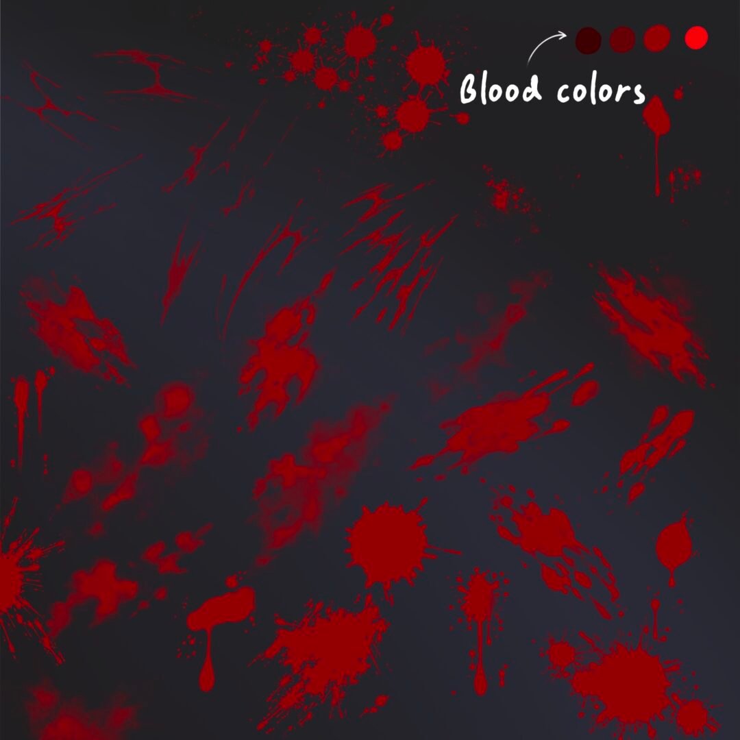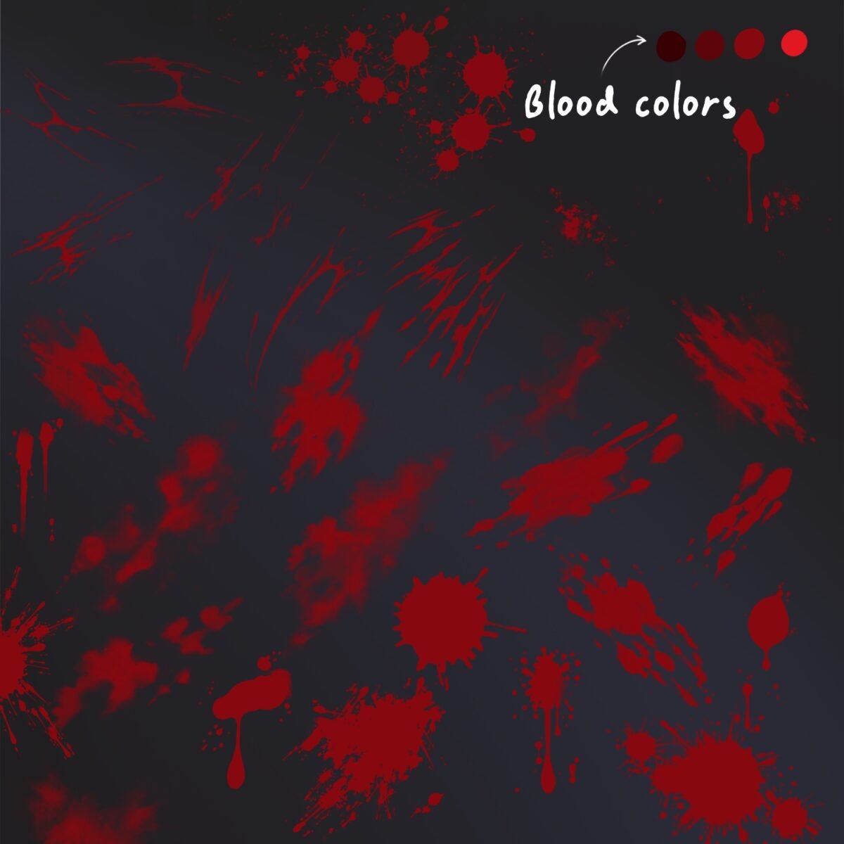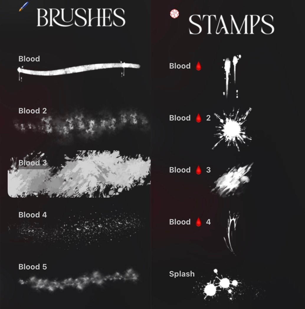 Every brush was made with love and a little bit of chaos 🖤 — from smooth, realistic drips to textured splashes that feel alive. Some are perfect for subtle blood effects on clothing, others for wild horror textures or expressive lettering.