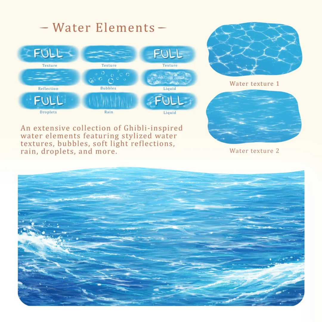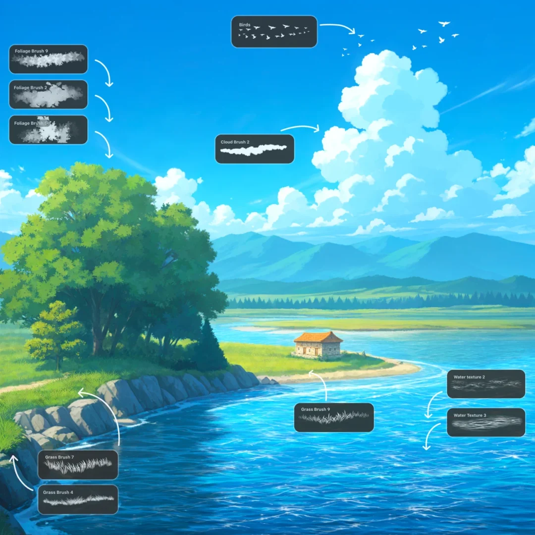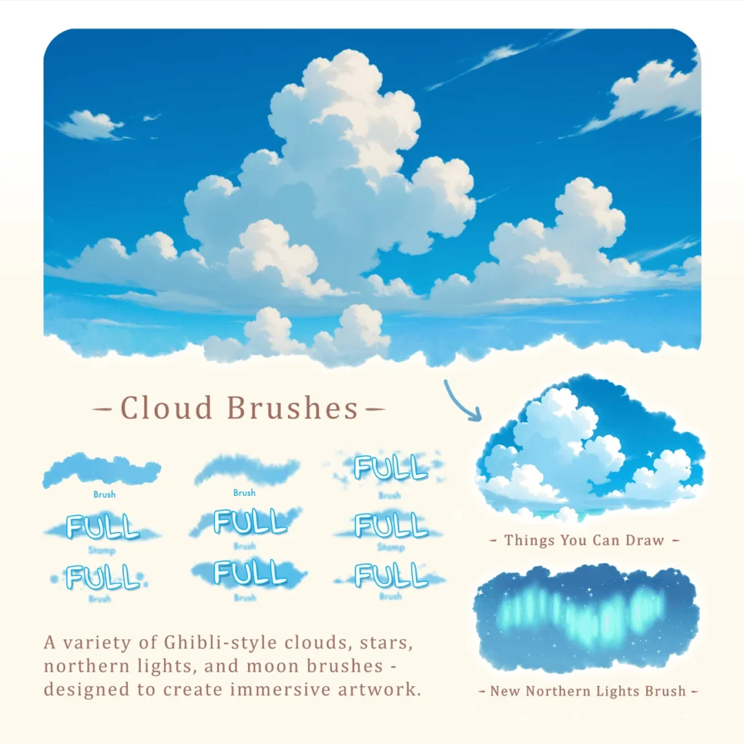 Studio Ghibli-inspired Procreate Brushes will help you create nostalgic anime-style nature and landscape illustrations on iPad with 30 handmade brushes: clouds, sky, stars, water textures, rain, bubbles, foliage, leaves, grass, flowers, vines, and animal brushes — perfect for backgrounds, scenery, and atmospheric paintings. This set is designed for artists of all levels!