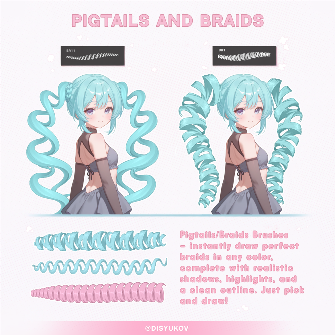 Create gorgeous hair with just one swipe! This set of 20 brushes for Procreate makes drawing hairstyles effortless — featuring built-in outlines with separate fill, elegant braids and pigtails, glossy highlights, and flowing dimensional effects.